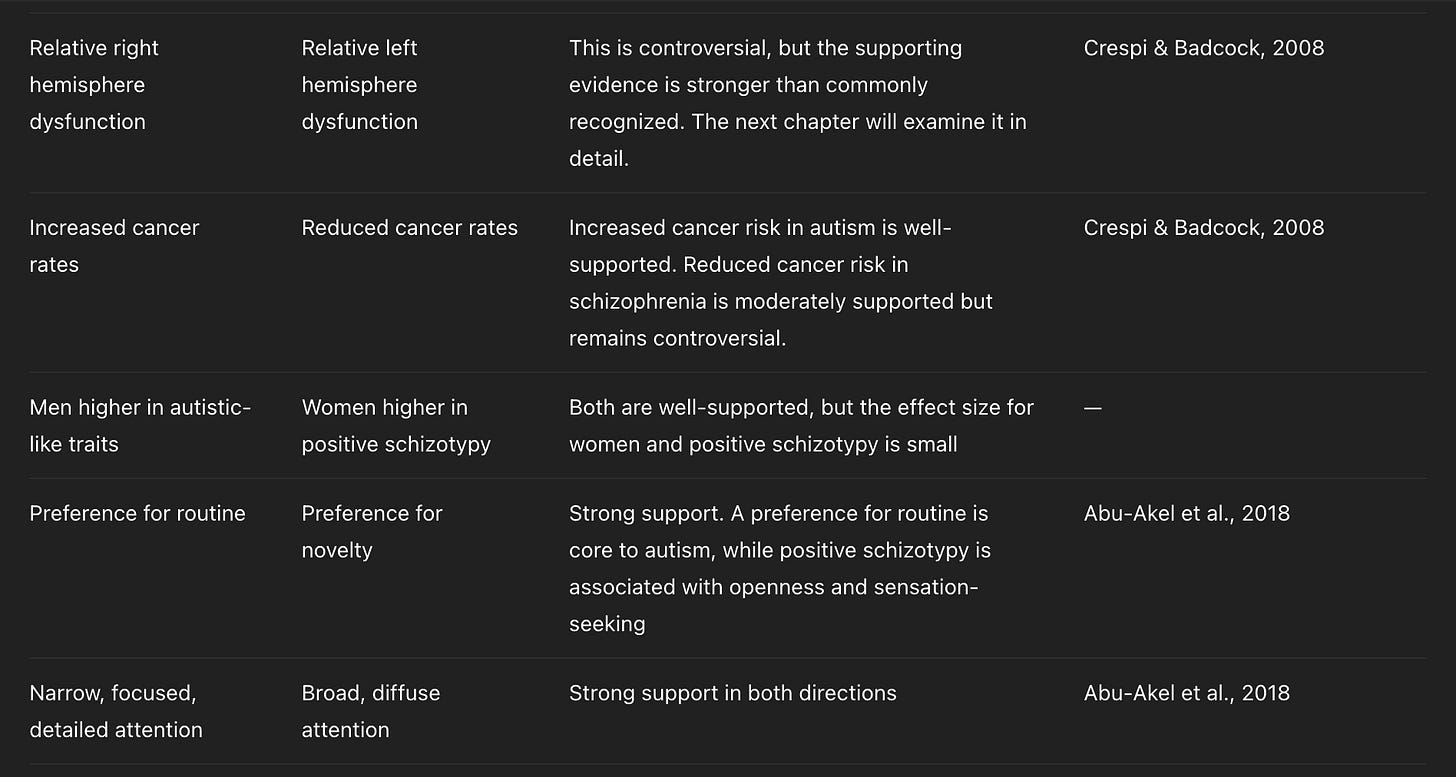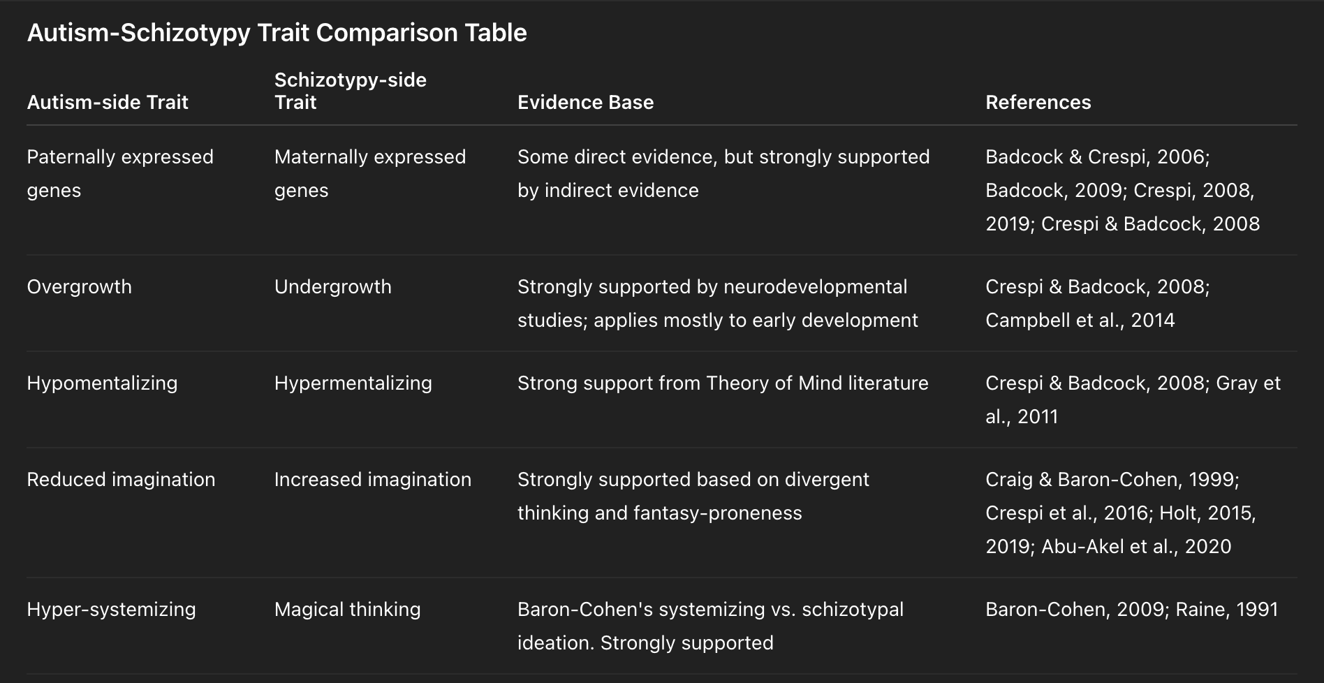 2. All of these diametric traits are moderately to strongly supported by current evidence because autism and psychosis spectrum conditions really are cognitive and genetic opposites.