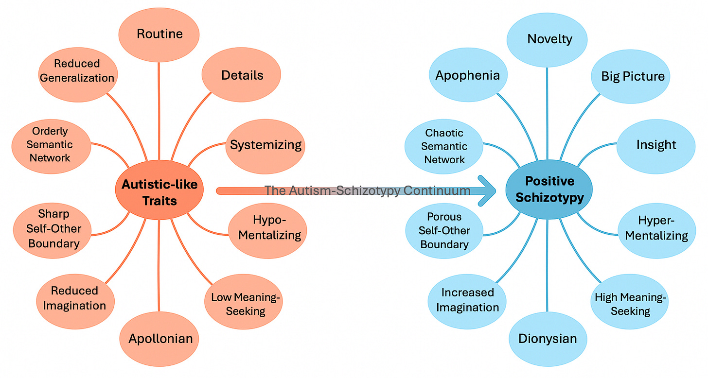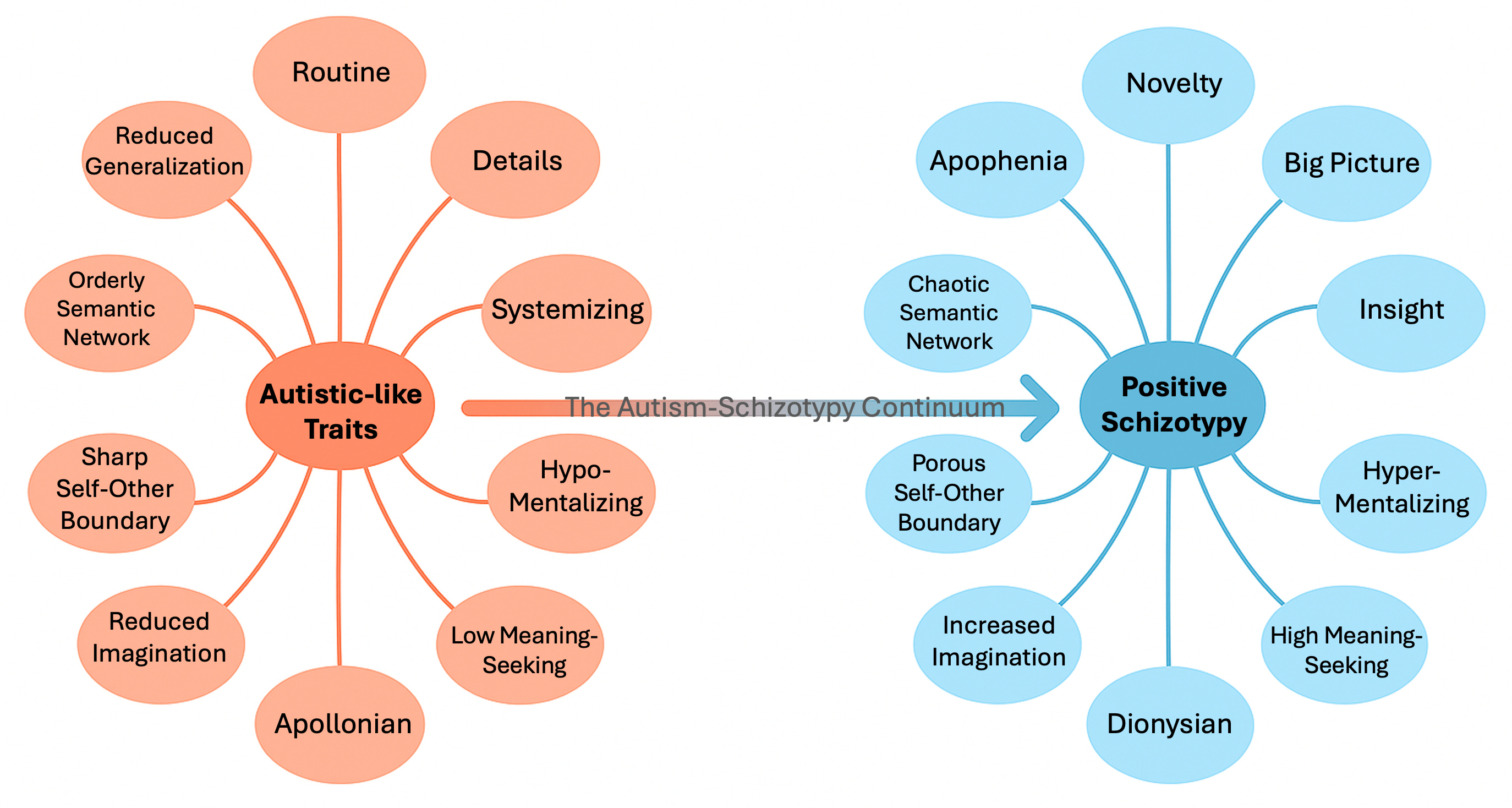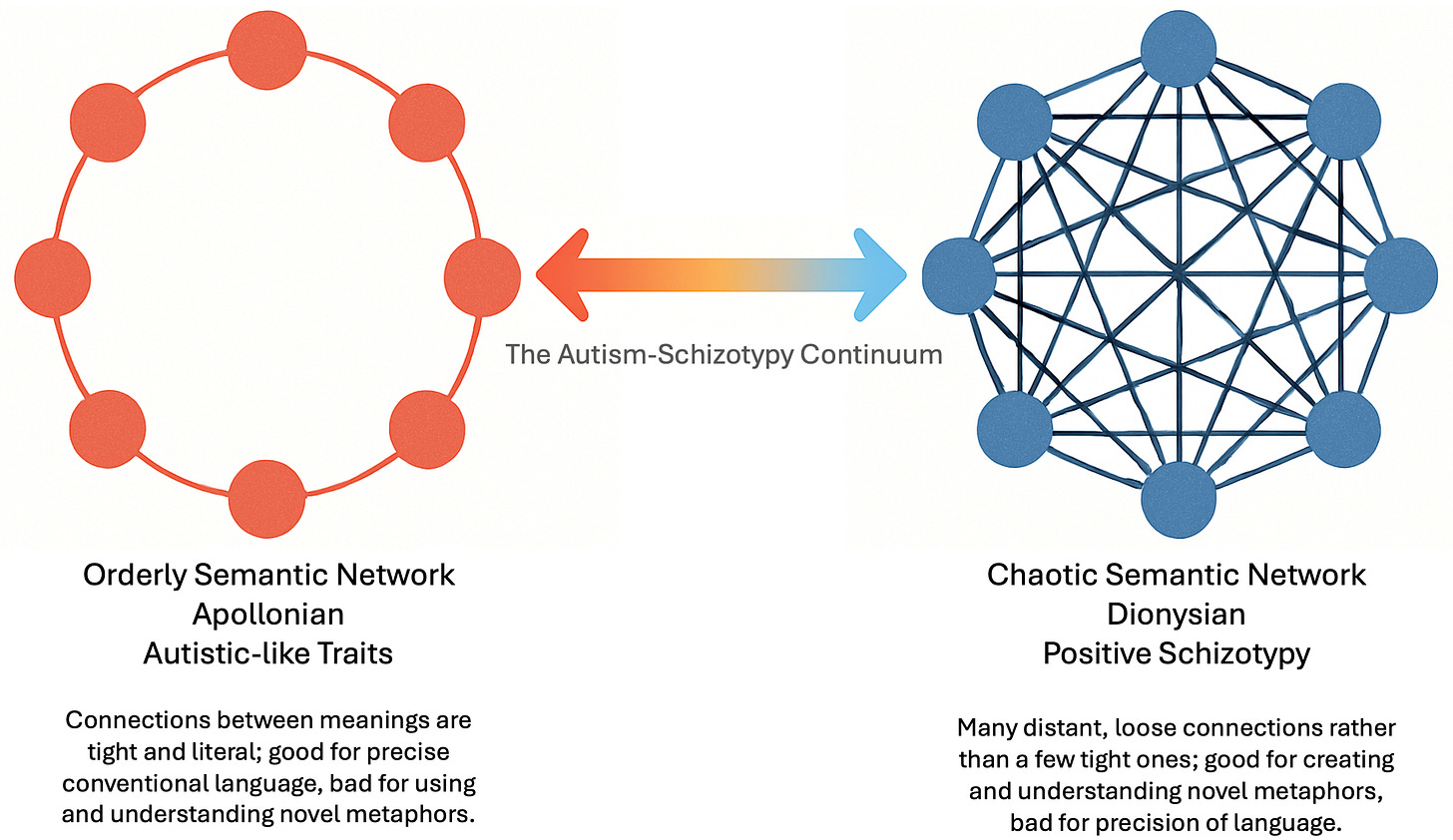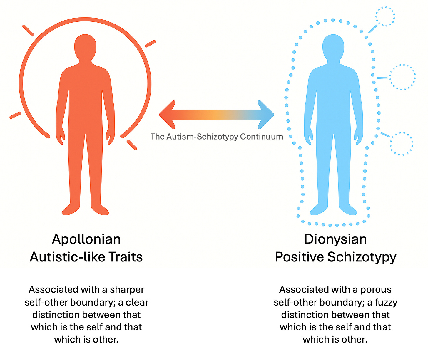 This contrast closely mirrors Nietzsche’s archetypes: the Apollonian emphasizes individuality and structure; the Dionysian dissolves boundaries into a kind of primal unity. The self-other distinction along the autism-schizotypy continuum reflects this psychological tension.