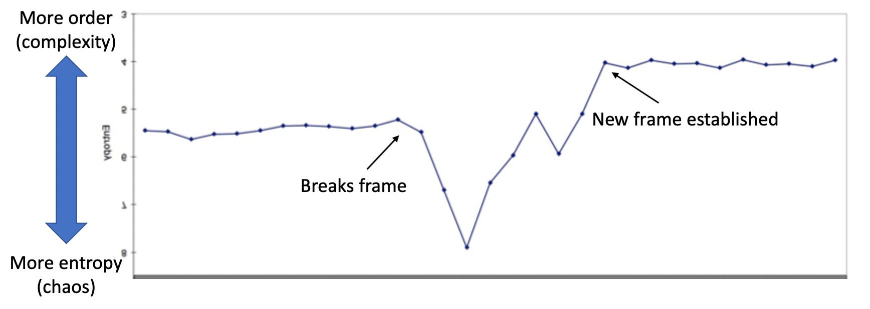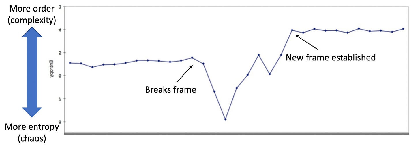 We can see that the person starts out with a moderate level of entropy. When they break frame, there is a “descent into chaos” (i.e., a temporary increase in entropy). When they establish a new frame, they re-emerge from this state of high entropy into a new stable state in which there is even less entropy than before. We can summarize this process like this: