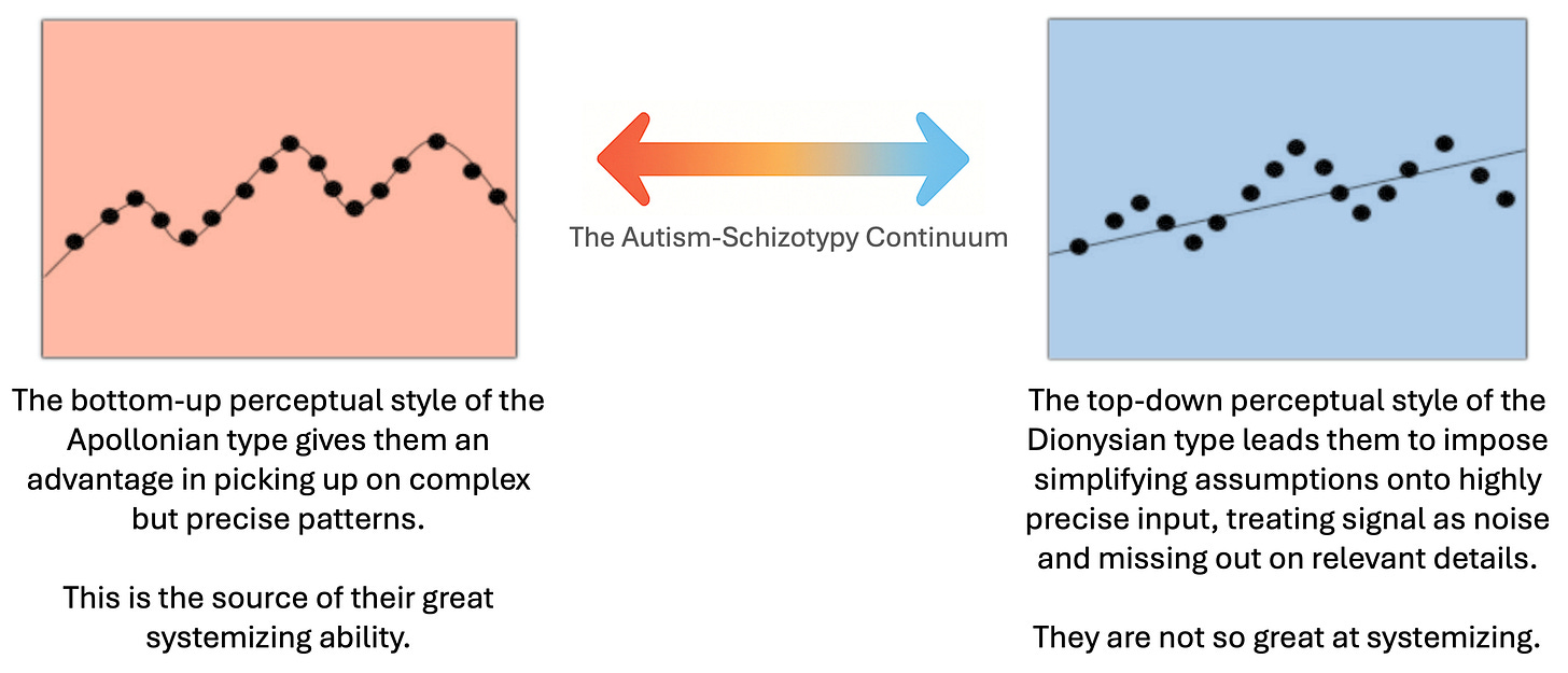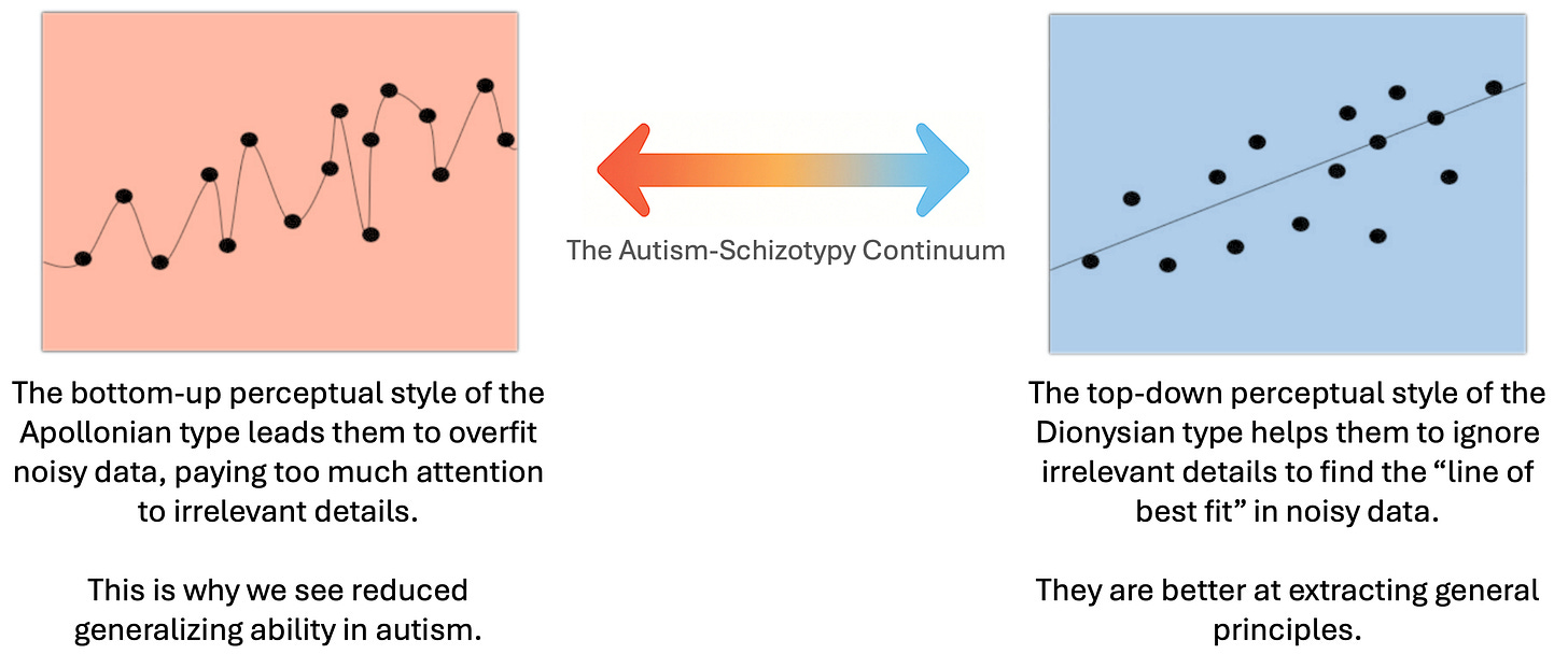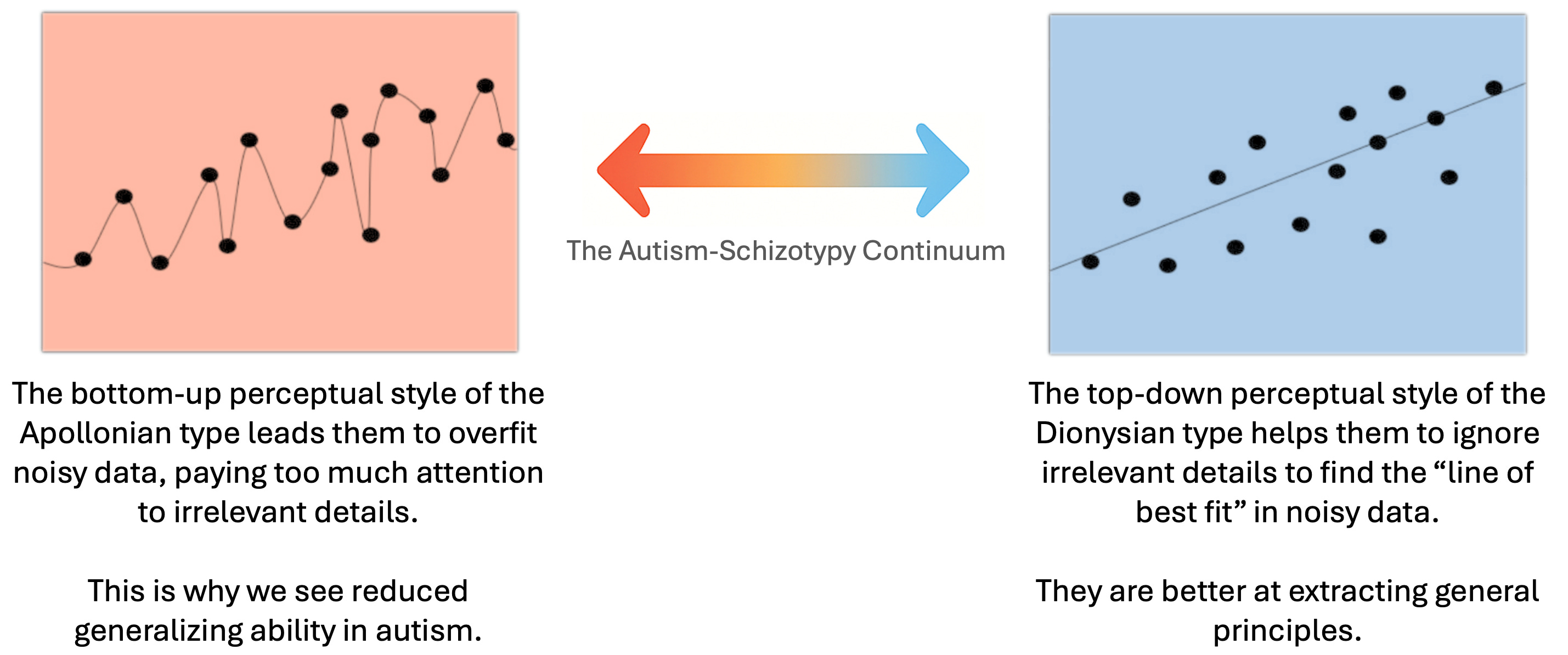 The bottom-up, precise perceptual style of the Apollonian type leans towards overfitting while the top-down, fuzzy perceptual style of the Dionysian type leans towards underfitting. The figure below explains why the Apollonian type is better at solving the complex but structured problems associated with systemizing ability: