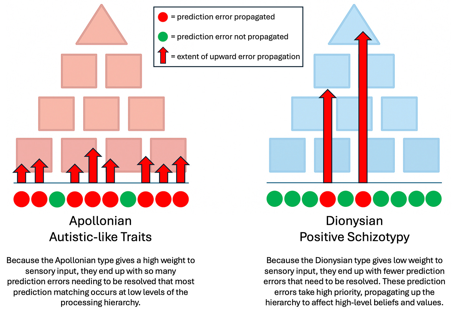 In autism, inflexibly high weight given to sensory input means that prediction matching tends to take place at low levels of the hierarchy (Van de Cruys et al., 2014, 2017). The low weight given to sensory input with positive schizotypy would have the opposite effect. Because the Dionysian type pays attention only to large errors and ignores smaller ones, prediction errors propagate farther up the hierarchy, affecting values, goals, and beliefs at higher levels of abstraction. See the figure below for a visual demonstration of this idea: