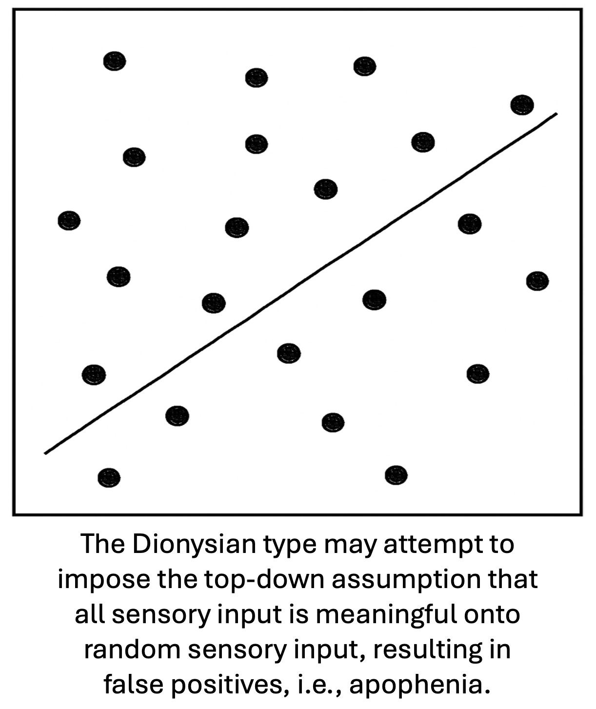 The PSI hypothesis suggests that the Dionysian type’s perceptual system registers only large deviations from its predictions, ignoring minor details. Because the Dionysian type’s perceptual system usually filters out low-level noise, they will learn to assume that sensory input mainly represents signal rather than noise. This is usually a good assumption. Most sensory inputs we deal with are part of some kind of pattern, even if that pattern is not readily apparent. But in a situation where the sensory input is nothing but random noise, the Dionysian type may still attempt to impose the top-down assumption of a pattern onto this random input. This results in false positives, also known as apophenia.