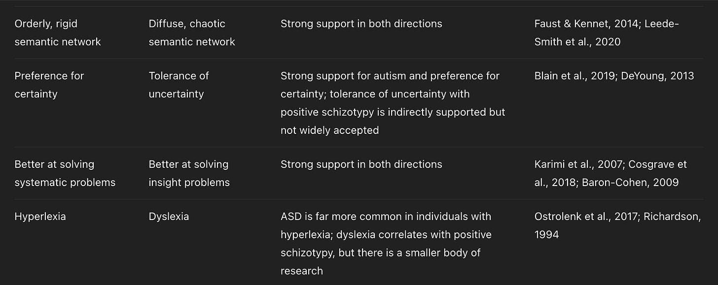 In my 2022 paper, I argued that the PSI hypothesis can explain a wide array of diametrically related traits along the autism-schizotypy continuum. Those traits, along with some new ones, are summarized in the diagram below.