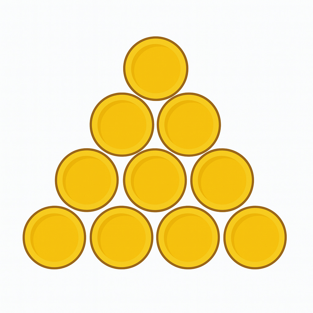 The solution lies in moving the coins on the bottom left, the bottom right, and the very top. The two bottom coins can be used to make a new four coin “base” out of the second row, while the coin at the top can be moved to the bottom to make a new point of the triangle.